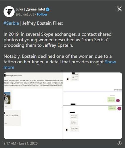 Prema najnovijim dokumentima iz dosijea Džefrija Epstajna, koji su sada dospeli u javnost i koji su se pojavili na društvenim mrežama, tokom 2019. godine u više prepiski na Skajpu, jedan kontakt je delio fotografije mladih žena koje su opisane uz dodatak da su "iz Srbije", nudeći ih Epštajnu. Epstajn odbio jednu od žena iz Srbije zbog tetovaže Zanimljivo je da je Epstajn odbio jednu od ponudenih žena zbog tetovaže na prstu, što pruža uvid u njegove lične kriterijume pri odabiru, u kojima je koncept "čistoće" imao važnu ulogu, stoji u jednom od tvitova na platformi "Iks". Podsetimo, američko Ministarstvo pravde objavilo je milione dosijea vezanih za slučaj Džefrija Epštajna, uključujući pornografske video snimke i slike.