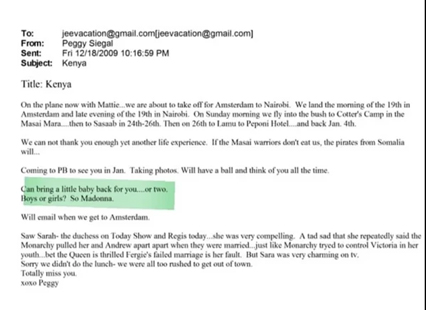 Čuvena publicistkinja iz Holivuda Pegi Sigal, poslala je mejl Džefriju Epstajnu nudeći da mu donese "malu bebu" sa putovanja u Afriku, rekavši da bi taj potez bio "tako Madona". Pegi Sigal u porukama Epstajnu: "Ne mogu dovoljno da ti zahvalim" Poruke koje je Pegi Sigal navodno slala Epštajnu u decembru 2009. godine pojavile su se nedavno objavljenim fajlovima. Mejl je otkriven usred najnovije tranše od 3 miliona dokumenata koji se odnose na prethodne istrage o Epštajnu, koji je umro u zatvoru 2019. godine